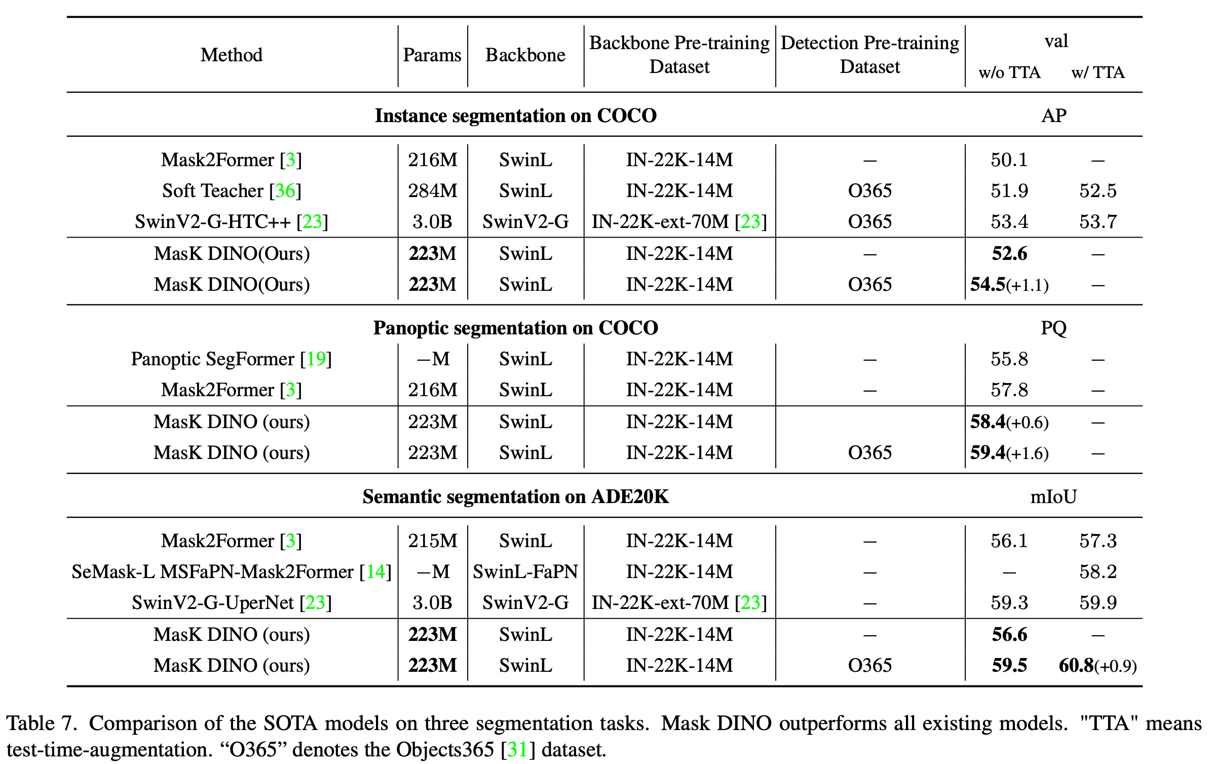 60.8 mIoU on ADE20K, 59.4 PQ on COCO