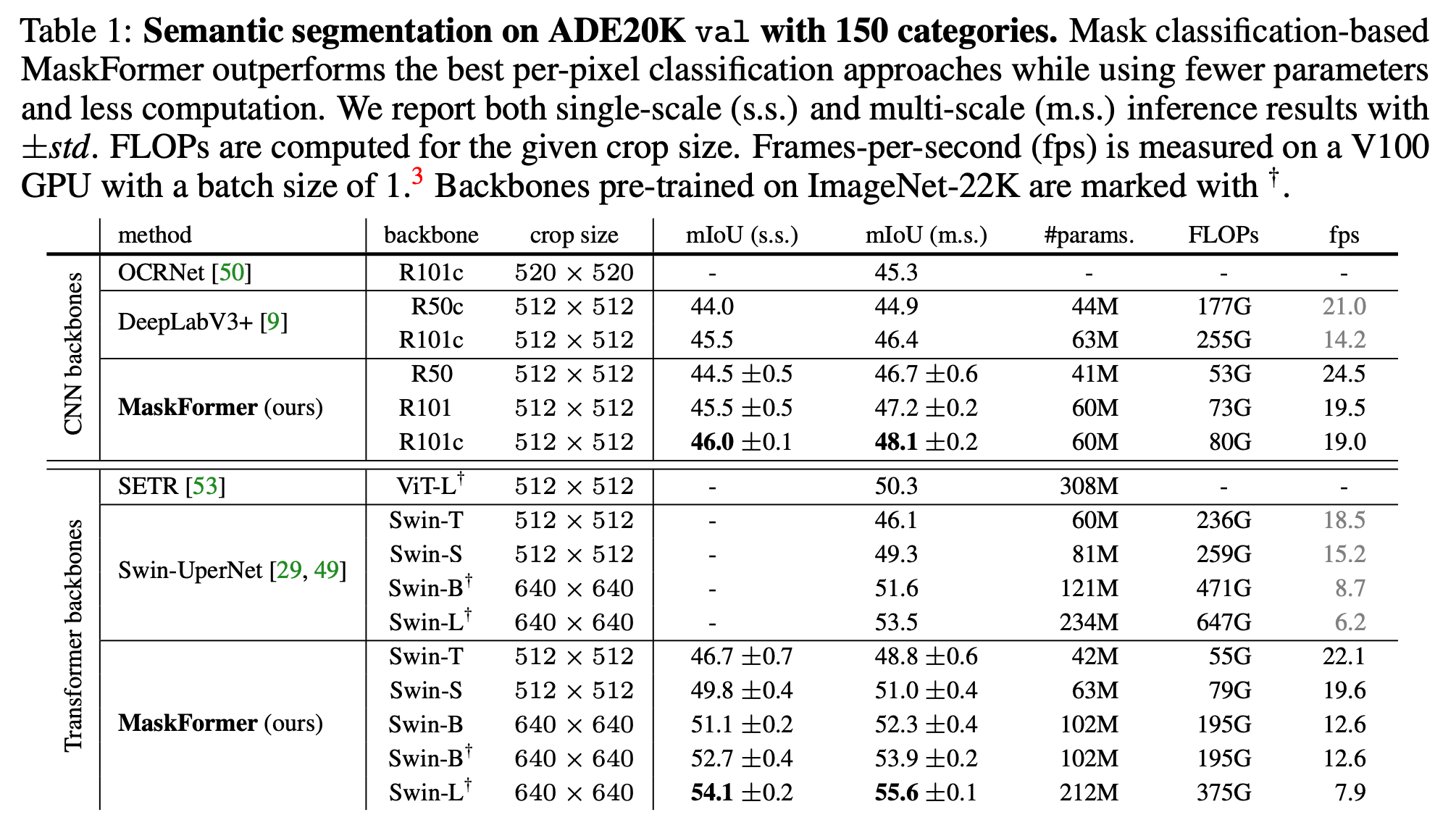 단일 클래스 추론 에서도 Swin-transformer backbone을 사용해서 ADE20K 데이터셋에서 SOTA를 달성함