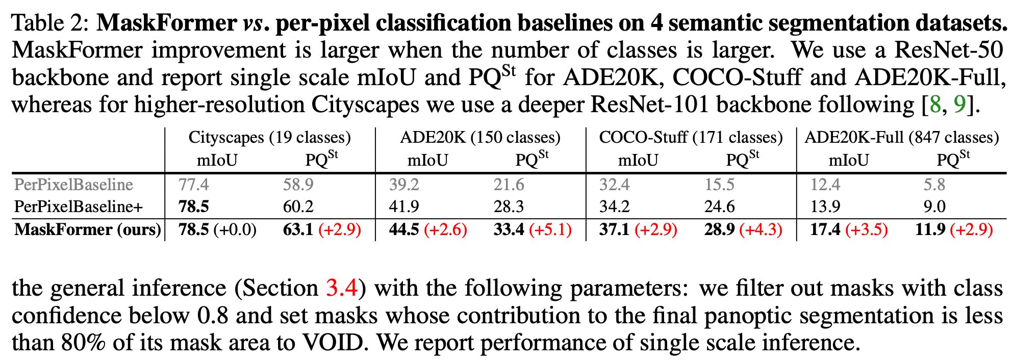 - ADE20K val set 에서 같은 CNN backbones (e.g., ResNet)을 사용하면 MaskFormer 가 DeepLabV3+ 보다 1.7 mIoU 가 더 높게 나옴
