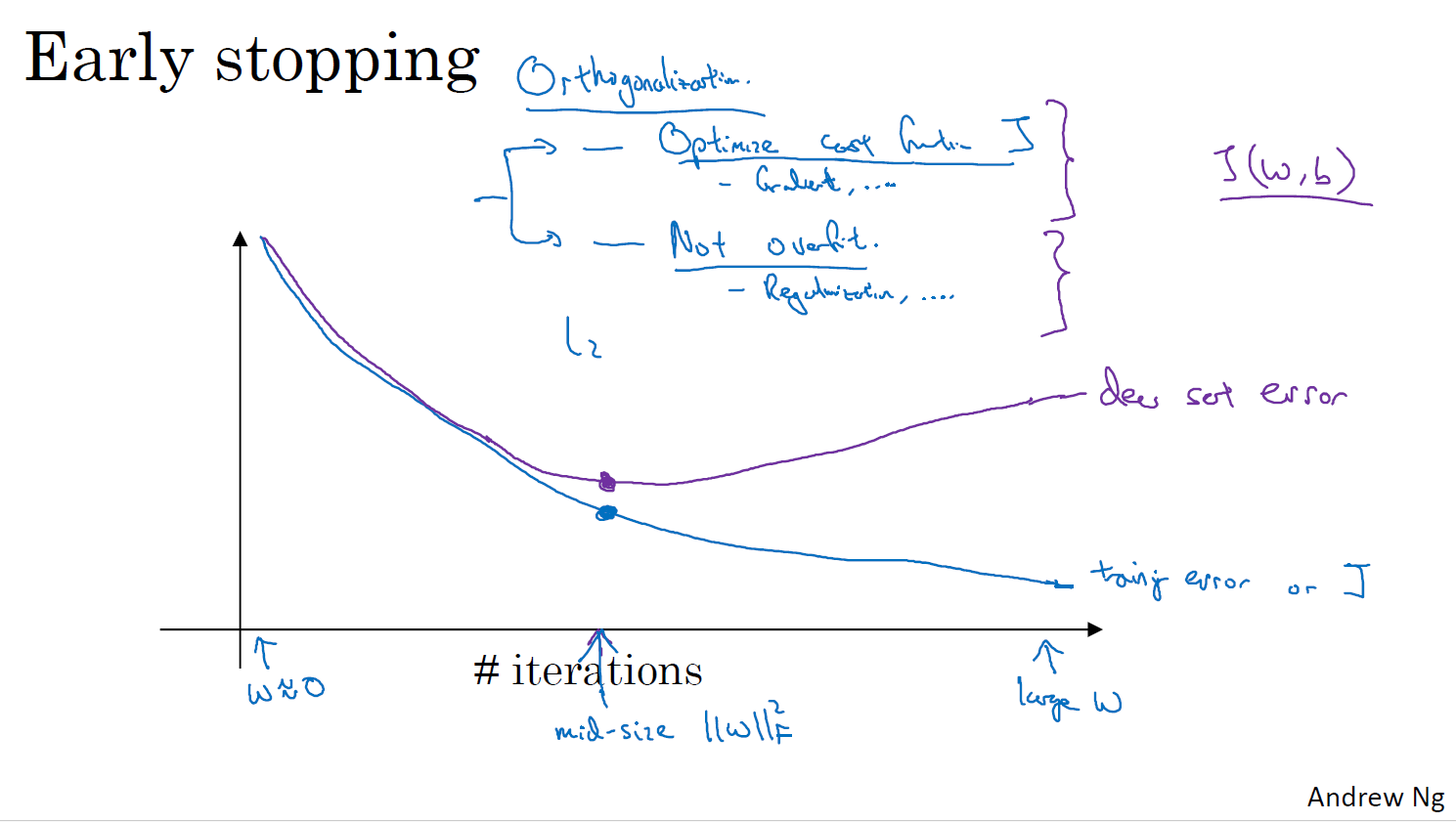 일반화와 비슷하게, 쓰이는 기술 중 early stopping이라고 하는 기술이다. early stopping은 w의 비율이 중간 정도 되는 시점에서 중지시키는 역할을 합니다 그러므로 L2 일반화와 비슷하게, 신경망에서 w 파라미터수가 비슷한 노름을 선정하여 결과적으로 신경망이 덜 overfitting하게 만들어주는 것입니다 early stopping의 주된 단점은, 이것이 이 2개의 업무를 묶는다는 것입니다. 그러면 이 2개의 별개 문제를 단독으로 풀 수가 없게 됩니다. 그러면 결과적으로 여러 가지 시도할 수 있는 방법들에 대해서 더 복잡하게 만드는 경향이 있습니다 조기 종료는 딥러닝 모델 학습에서 과적합을 방지하고 모델 성능을 향상시키는 데 유용한 기법이지만, 단점도 존재합니다. 따라서, 조기 종료를 사용할 때는 장단점을 고려하고 적절하게 설정해야 합니다. 또한, 조기 종료 외에도 다른 과적합 방지 기법 (예: 데이터 증강, 드롭아웃, L1/L2 정규화)과 함께 사용하는 것이 효과적입니다.