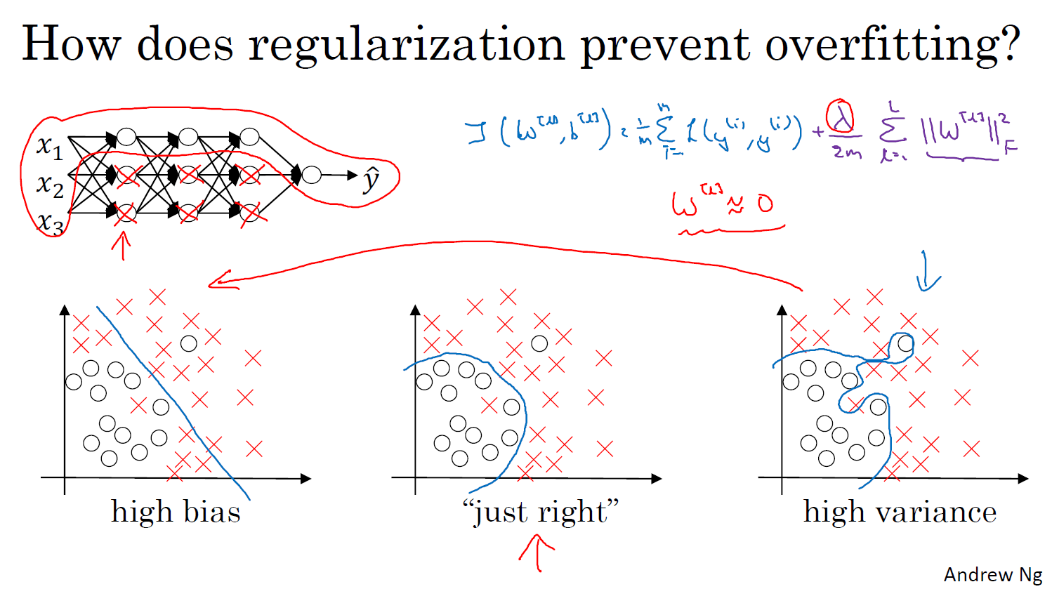 정규화 람다를정말, 정말 크게 만들면, 가중 매트릭스들, W를 합리적으로 0에 가깝게 설정하도록유도할 수 있다는 것입니다 위 이미지 처럼 신경망을 만든다
