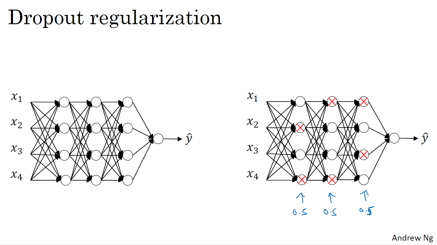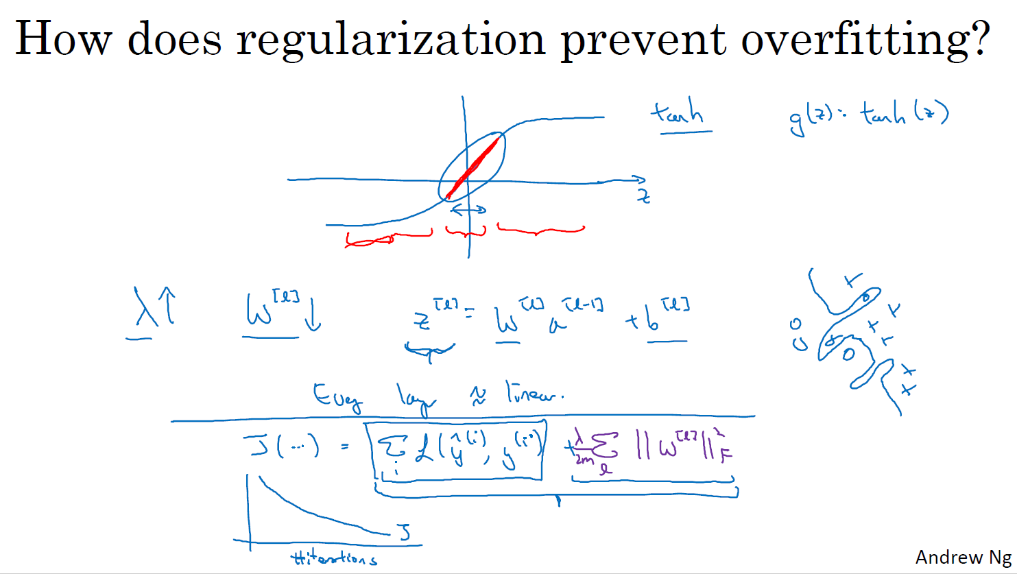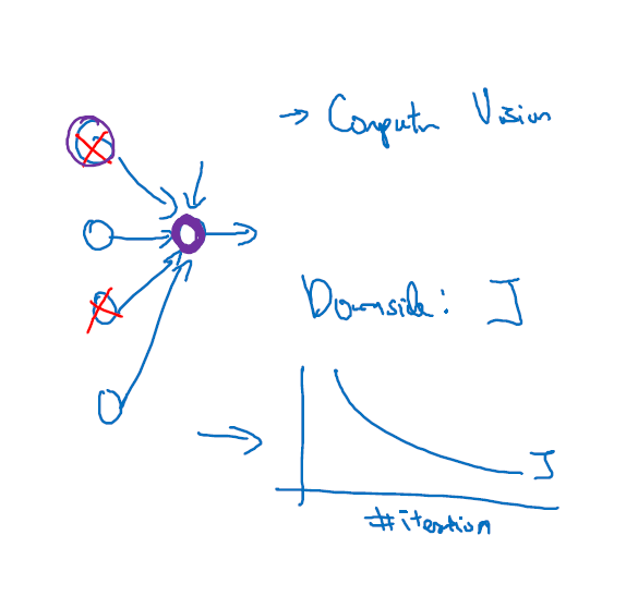 더 작은 신경망을 사용하는 것은 정규화 효과가 있는 것처럼 보인다. 한 가지 특성에 의존하는 것을 피할 수 있다.가중치의 squared 노름을 줄이는 효과가 있고 그러므로 L2 정규화에서 본 것과 비슷하게 드롭아웃 구현의 효과는 그 강도가 L2 정규화와 유사하다 과적합을 피할 수 이싿.
