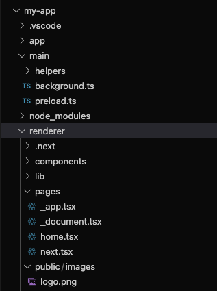 main은 데이터베이스 통신, 파일 처리 등 서버에서 실행되는 파일을 renderer은 실제 화면에 그려지는 page 파일로 구성.