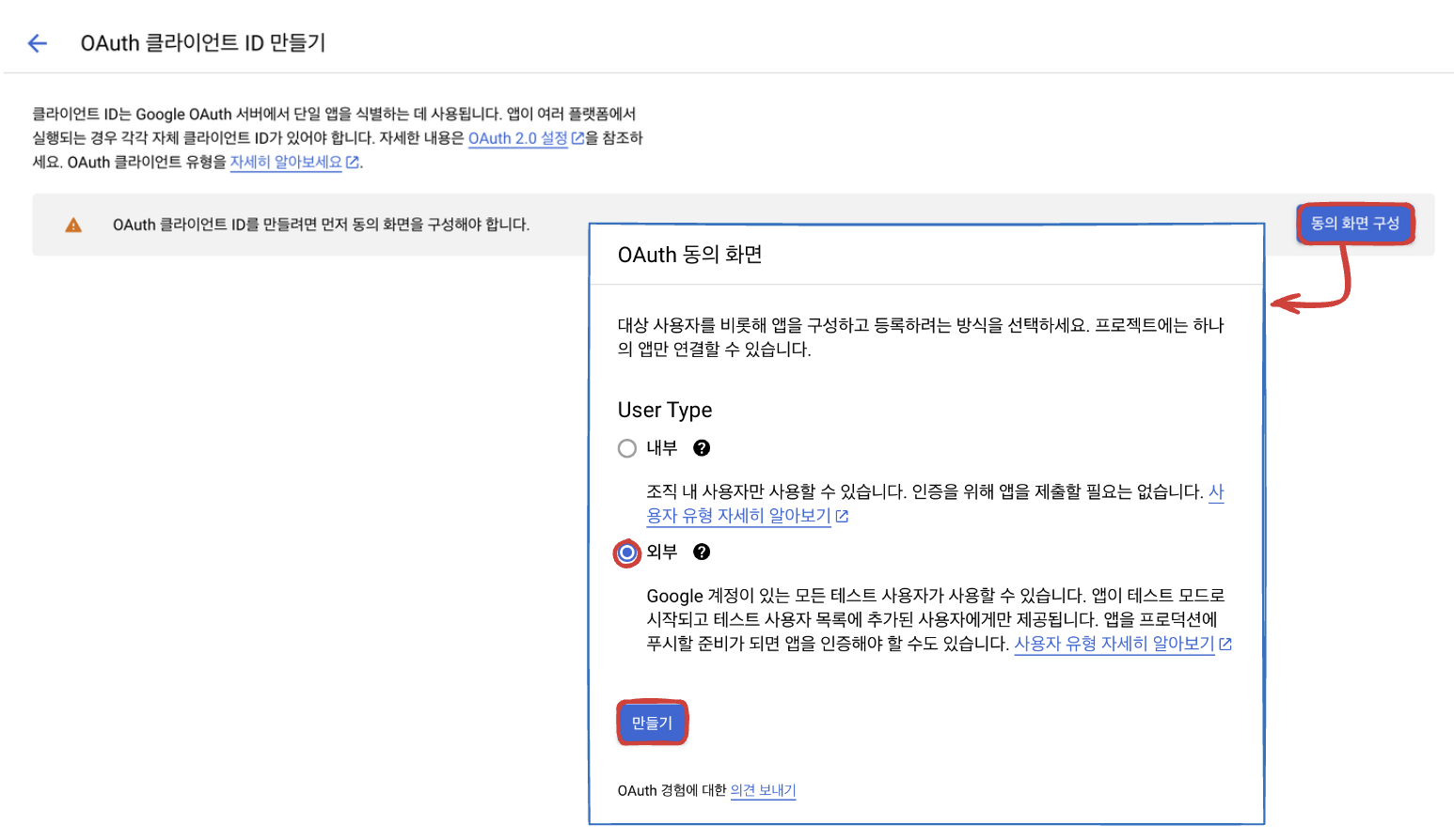 OAuth ํด๋ผ์ด์ธํธ ID๋ฅผ ์์ฑํ๊ธฐ ์ ์ OAuth ๋์ ํ๋ฉด์ ์ค์ ํฉ๋๋ค.