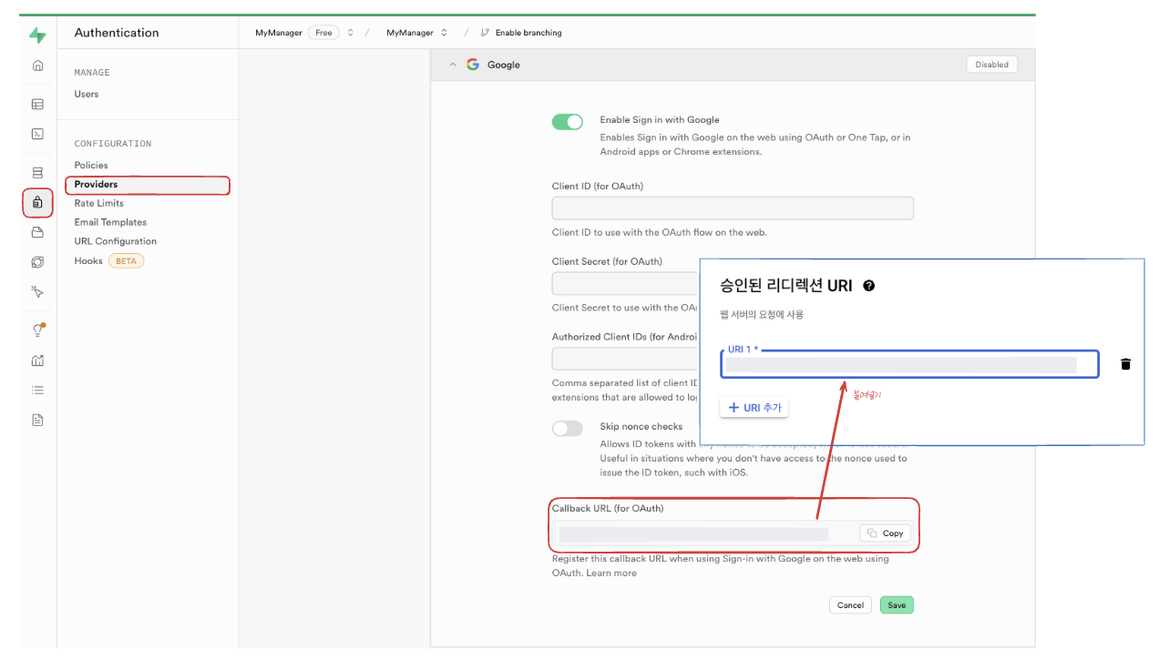 Supabase dashboard ์์ Authentication > Providers ์์ Google์ ํด๋ฆญํด ์ด๊ณ ํ์ฑํํฉ๋๋ค. Callback URL์ ๋ณต์ฌํ๊ณ ์น์ธ๋ ๋ฆฌ๋๋ ์