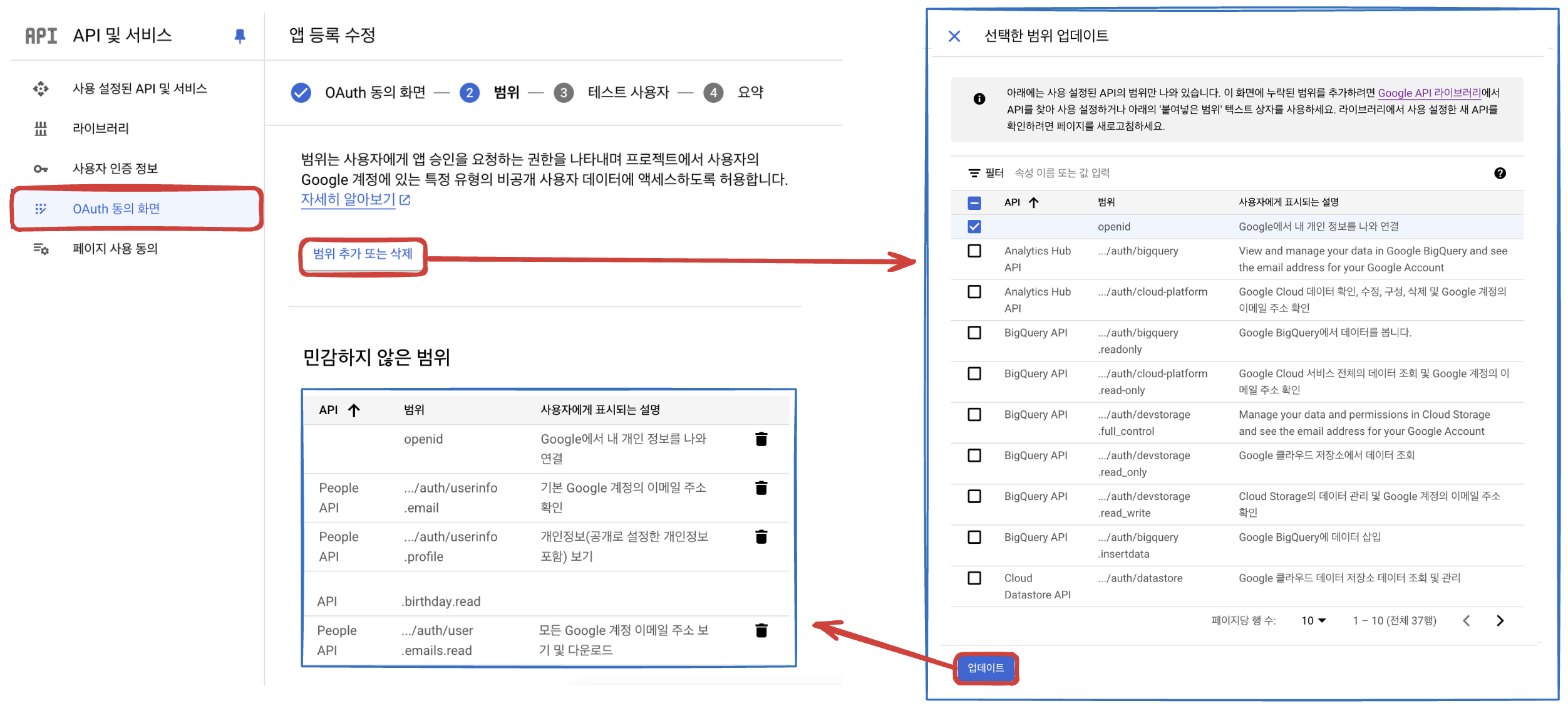 OAuth ๋์ ํ๋ฉด์ผ๋ก ์ด๋ํด ๋ฒ์(scope) ์ค์ ์์ ๋ฒ์ ์ถ๊ฐ ๋๋ ์ญ์ ๋ฒํผ์ ํด๋ฆญํ๊ณ openID์ People API ๊ด๋ จ๋ ํํฐ๋ง์ ์ถ๊ฐํ๊ณ ์