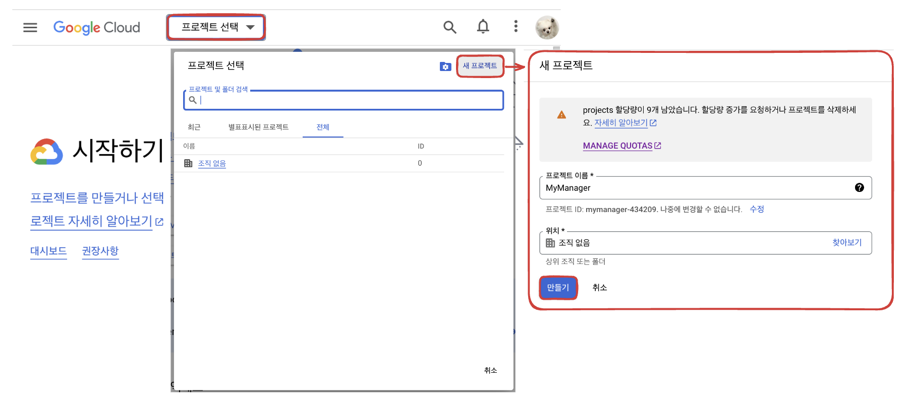 Google Cloud Platform(๊ตฌ๊ธ ํด๋ผ์ฐ๋ ํ์ด์ง)์์ ๋ก๊ทธ์ธํ๊ณ ์ ํ๋ก์ ํธ๋ฅผ ์์ฑํฉ๋๋ค.
