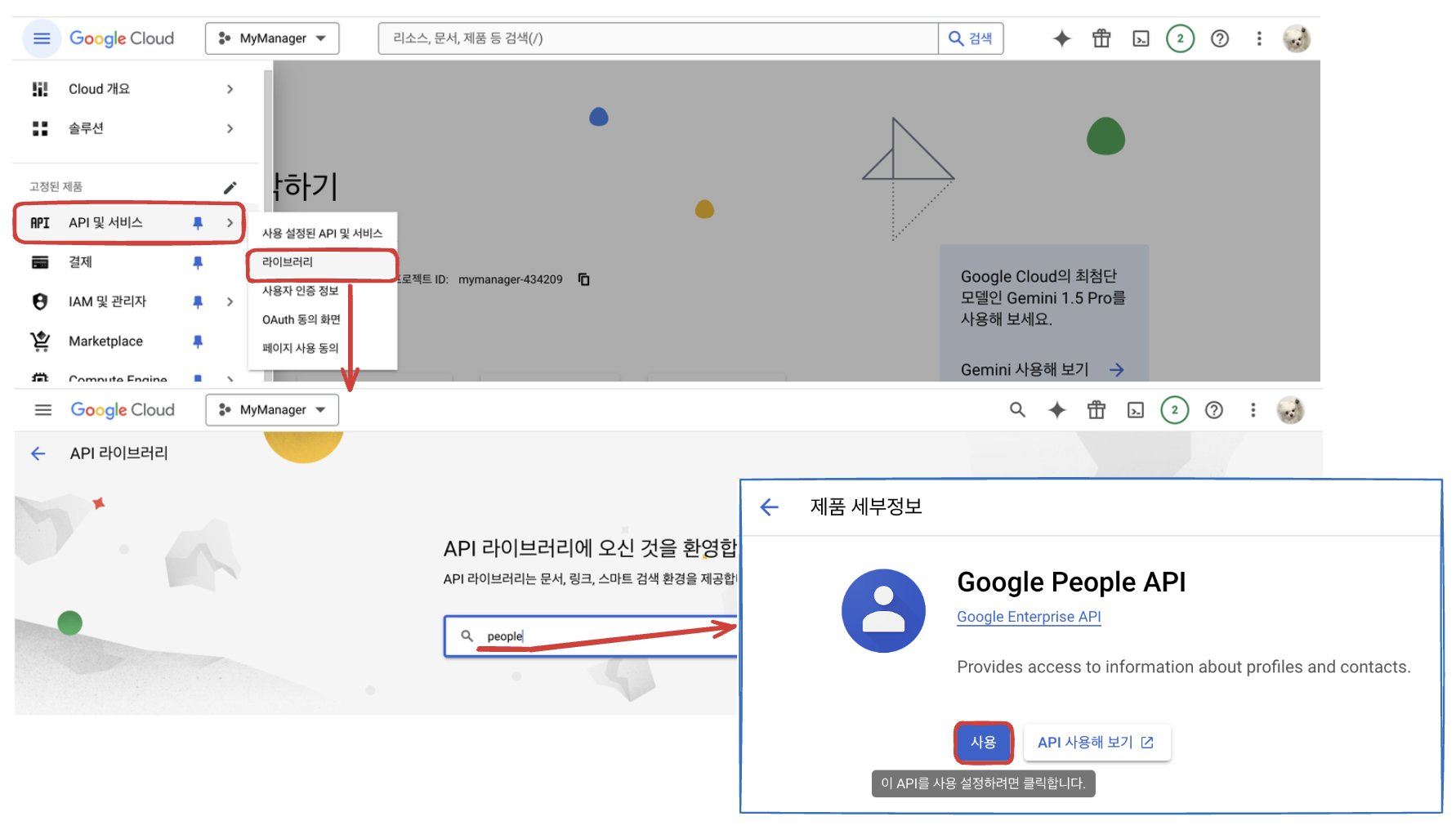 API ๋ฐ ์๋น์ค > ๋ผ์ด๋ธ๋ฌ๋ฆฌ ๋ก ์ด๋ํด์ people์ ๊ฒ์ํด Google People API๋ฅผ ์ฌ์ฉ ์ค์ ํฉ๋๋ค.