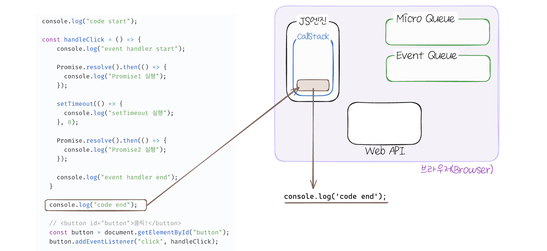 console.log('code end')가 스택에 등록되고 실행되어 콘솔에 출력하고 스택에서 제거됩니다.