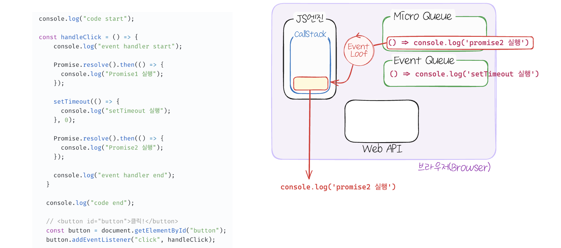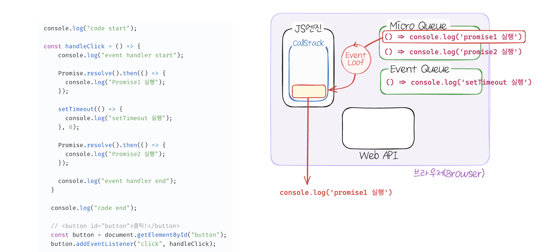 - 콜 스택이 비어있으면 마이크로태스크 큐 내의 작업이 이동되어 실행됩니다.