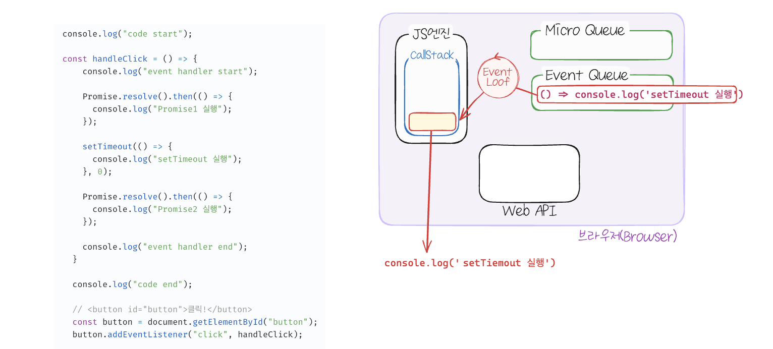 - 마이크로태스크 큐도 비어있으면 이벤트 큐 내의 작업이 이동되어 실행됩니다.