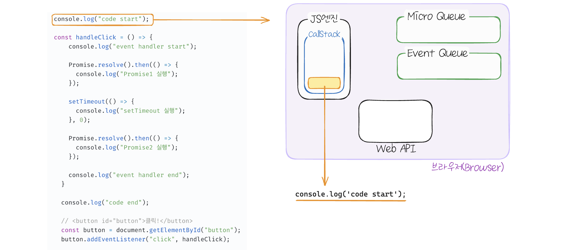 console.log('code start')가 스택에 등록되고 실행되어 콘솔에 출력하고 스택에서 제거됩니다.