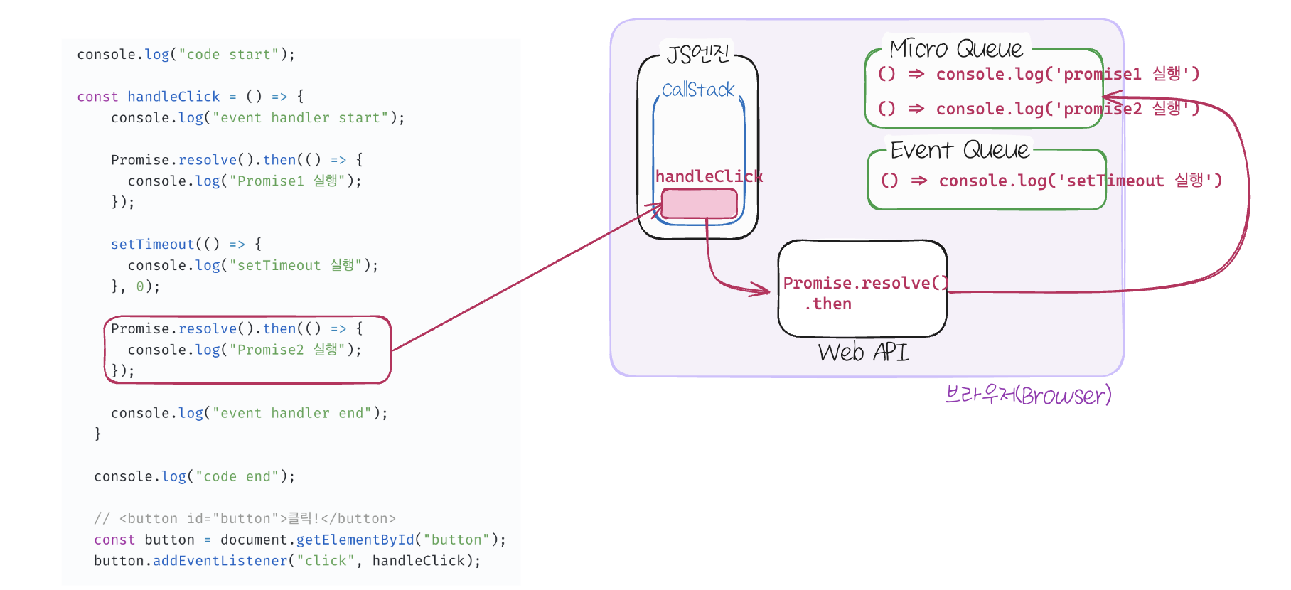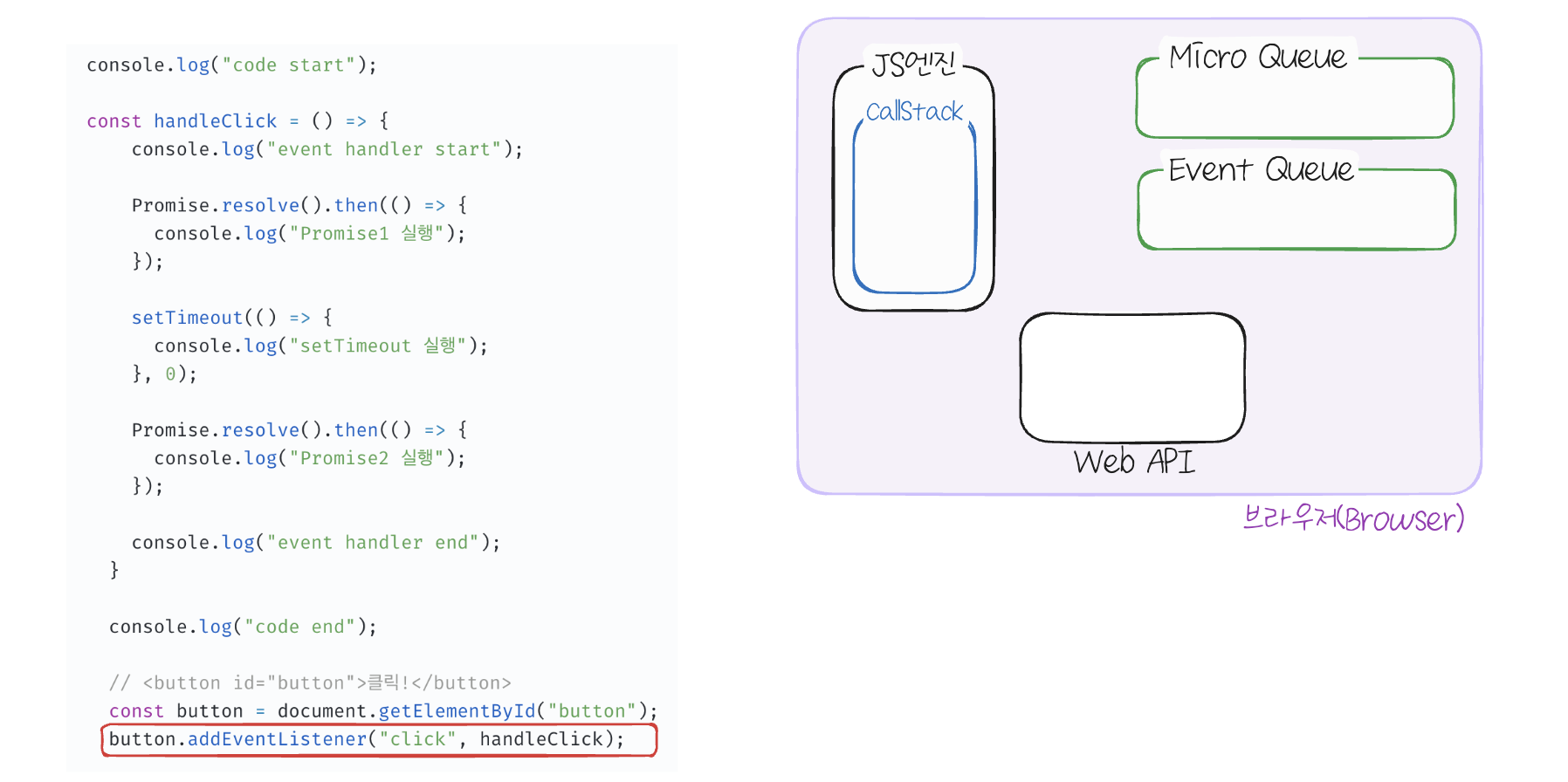 HTML 요소를 선택해 버튼 DOM 요소가 생성되고 addEventListener로 handleClick 함수가 버튼의 클릭 이벤트 핸들러로 등록됩니다. 이제 브라우저는 클릭 이벤트가 발생하면 실행할 함수를 기억합니다.