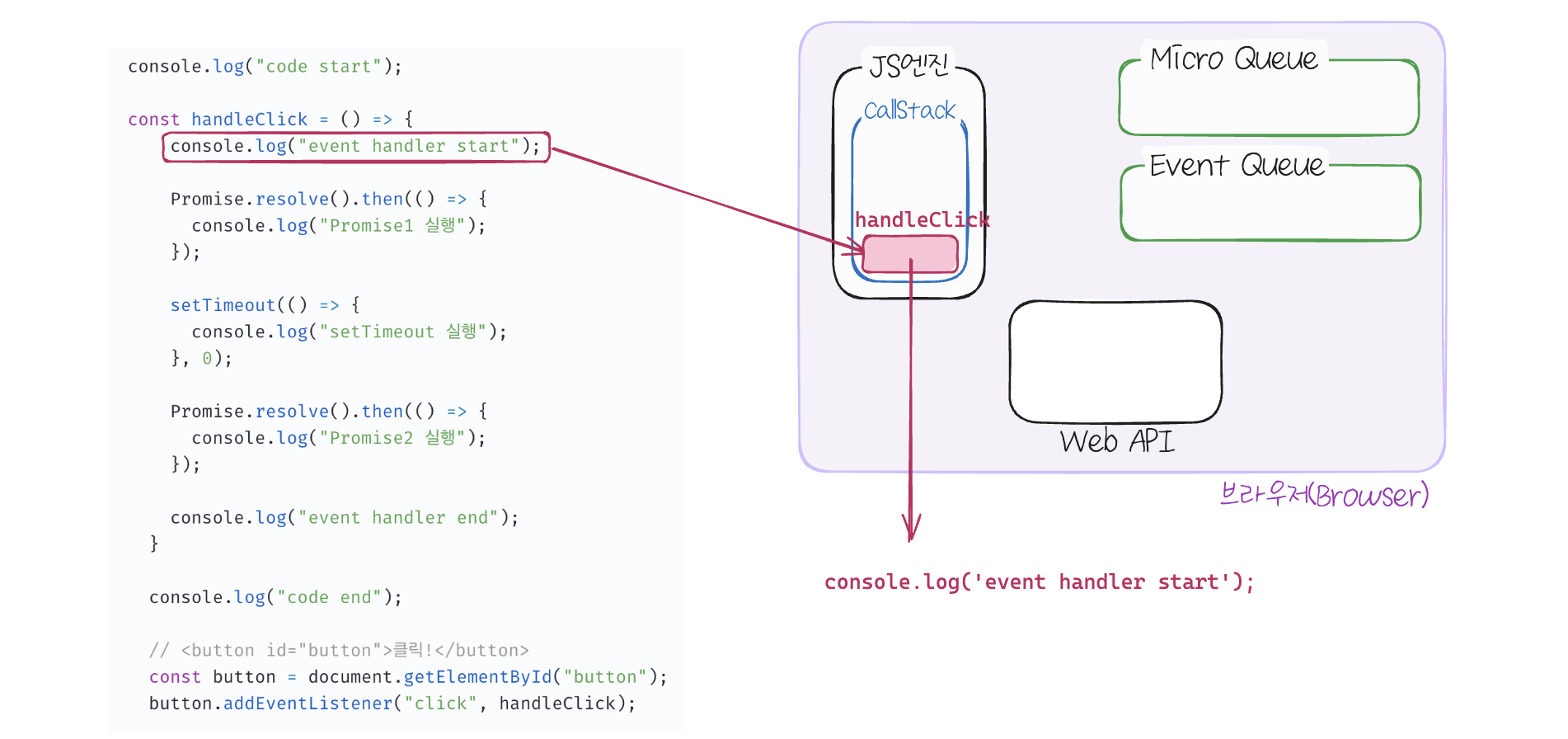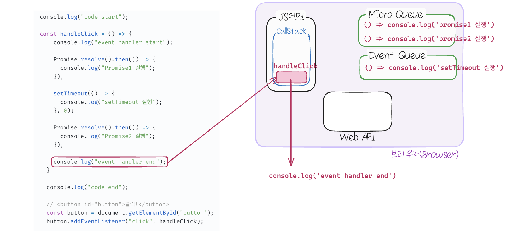 마지막으로 console.log('event handler end') 가 실행되고 콘솔에 출력되고 콜스택에서 handleClick 함수가 실행 종료되어 제거됩니다.