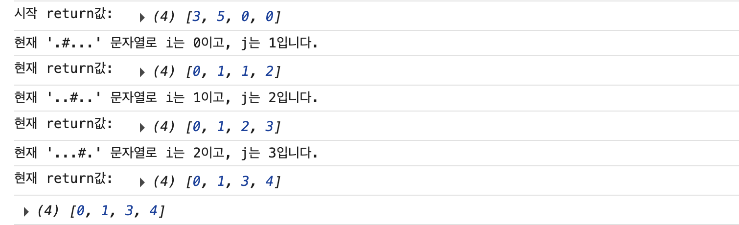 // ๊ฐ ๋ฌธ์์ด์ ์ฒซ '#' ์ธ๋ฑ์ค ๋ฐฐ์ด
