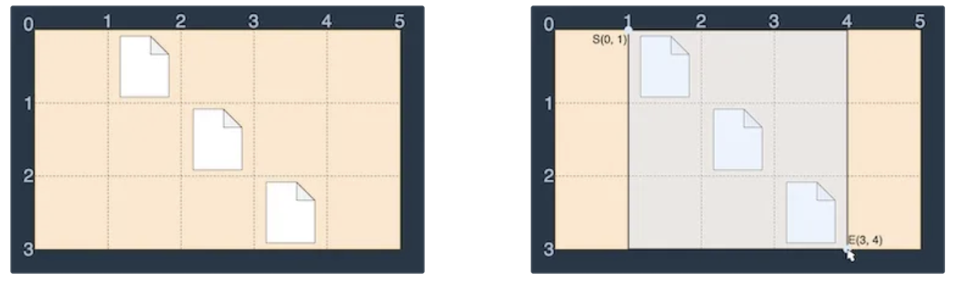 ์ด๋ฌํ ๋ฐํํ๋ฉด์์ ๋ค์ ๊ทธ๋ฆผ๊ณผ ๊ฐ์ด S(0, 1)์์ E(3, 4)๋ก ๋๋๊ทธํ๋ฉด ์ธ ๊ฐ์ ํ์ผ์ด ๋ชจ๋ ์ ํ๋๋ฏ๋ก ๋๋๊ทธ ํ ๊ฑฐ๋ฆฌ (3 - 0) + (4 - 1) = 6์ ์ต์๊ฐ์ผ๋ก ๋ชจ๋ ํ์ผ์ ์ ํ ๊ฐ๋ฅํฉ๋๋ค.