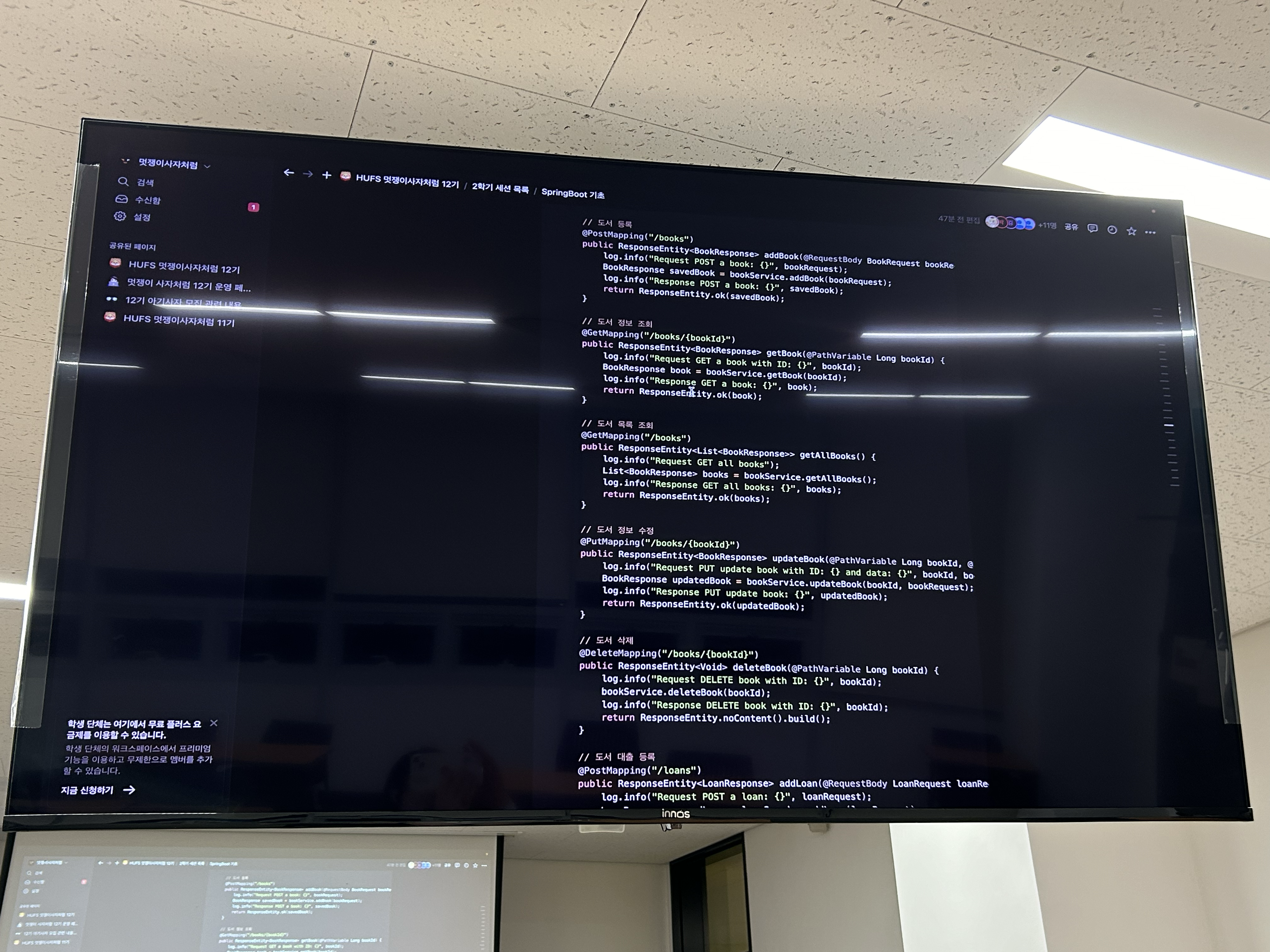 백엔드는 재웅님께서 Spring Boot 기초를 멋쟁이사자처럼 동아리방 도서관 프로젝트를 만들며 진행해주셨답니다!!