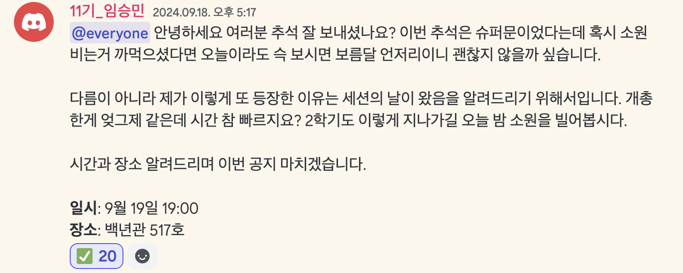 성공적으로 세션이 끝난 뒤 인사를 하는 동방 예의지국 출신 재웅님입니다.
