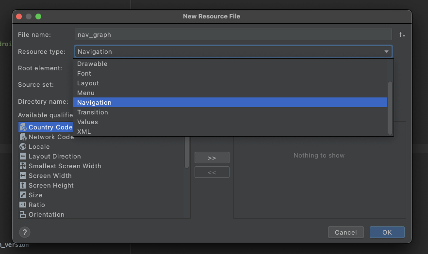 res에서 new -> Android Resource File -> resource type에서 Navigation를 선택하고 생성하면 res에 navigation 폴더안에 navigation graph가 생성된다.