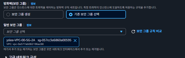 서브넷을 설정, 보안 그룹 만든거 적용, Instance 생성을 위한 정보를 입력한다.