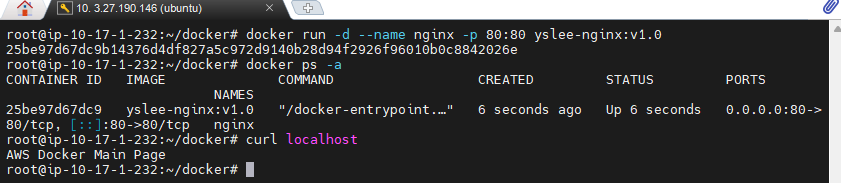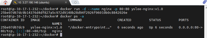 docker run -d --name nginx -p 80:80 yslee-nginx:v1.0