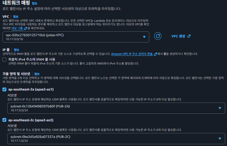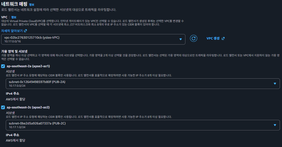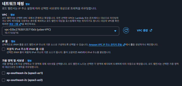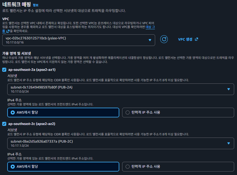 - 네트워크 매핑에서 VPC와 가용영역을 선택한다.