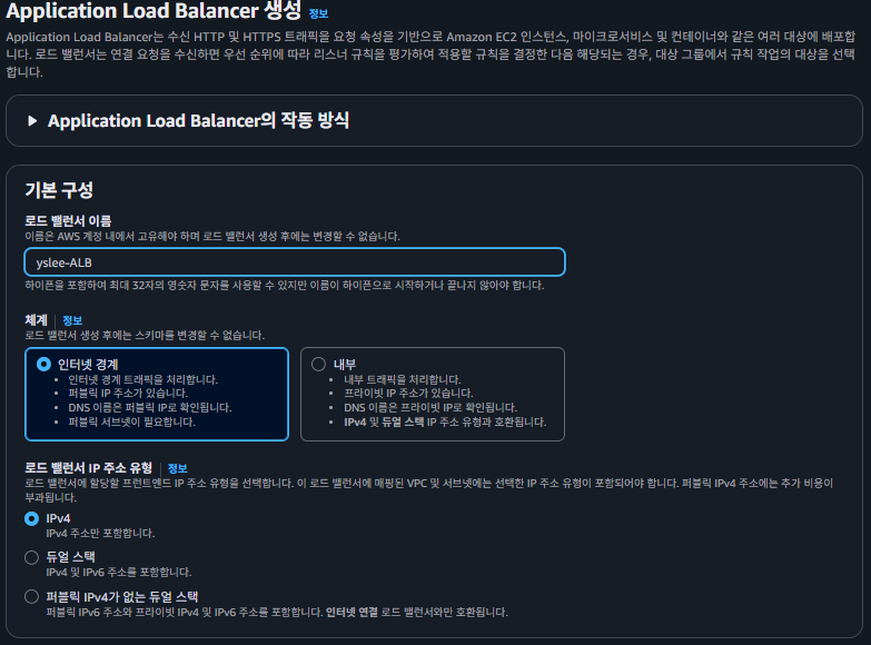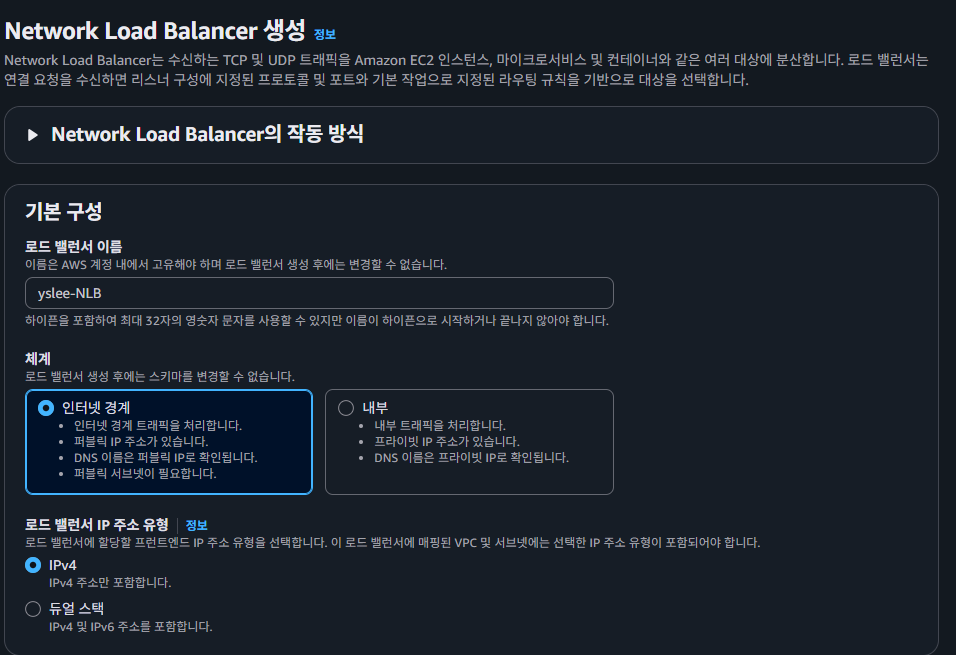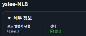 - yslee-NLB라는 네트워크 로드 밸런서를 만들고, 네트워크 매핑에는 VPC를 설정한다.