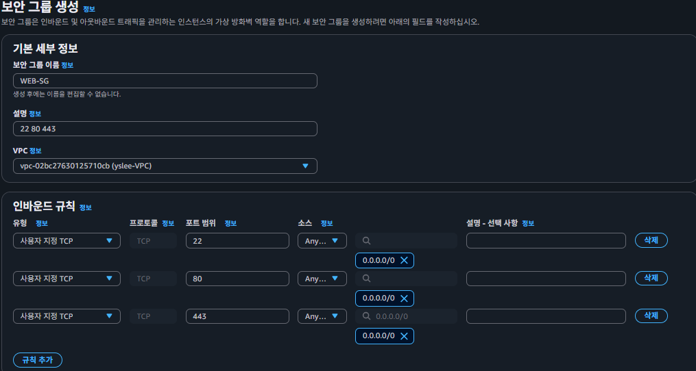 - WEB-SG 인바운드 규칙에 22, 80, 443을 선택한다. 0.0.0.0/0을 선택한다.