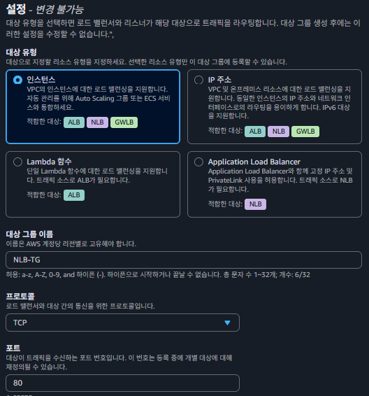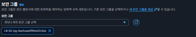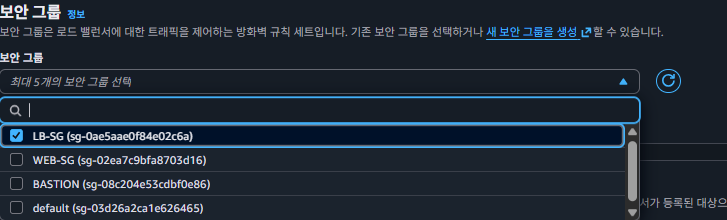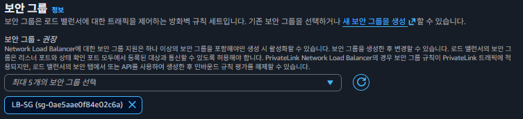- 보안 그룹 LB-SG를 설정한다. (대상 그룹 안뜨면 NLB-TG 가서 등록된 대상을 확인한다.)