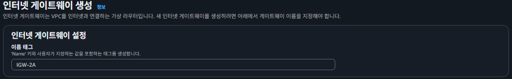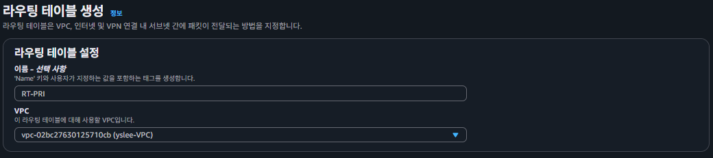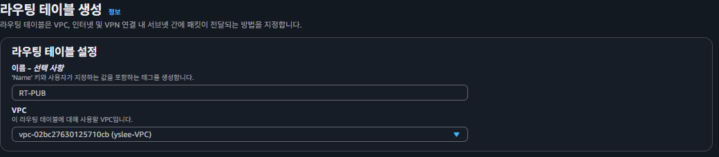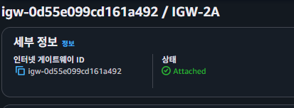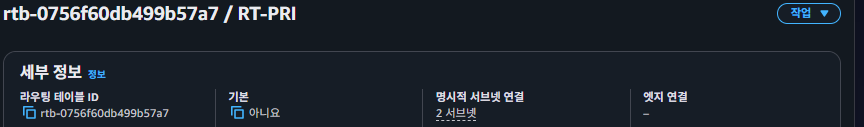 - 위에서 VPC에 IGW가 연결되어 있어야 라우팅 테이블 PUB 부분에 디폴트 설정할 수 있다.
