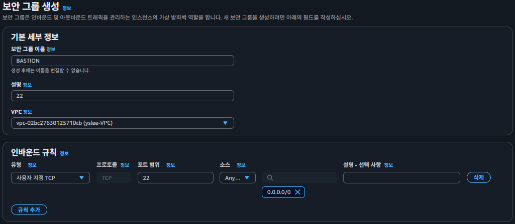 - BASTION을 위한 보안 그룹 생성, 인바운드 규칙에 22를 선택한다.