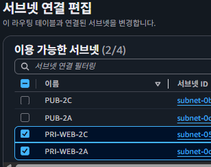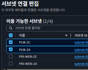 - 두번째로 가용 영역 및 서브넷에서 PUB-2A, PUB-2C를 선택한다.
