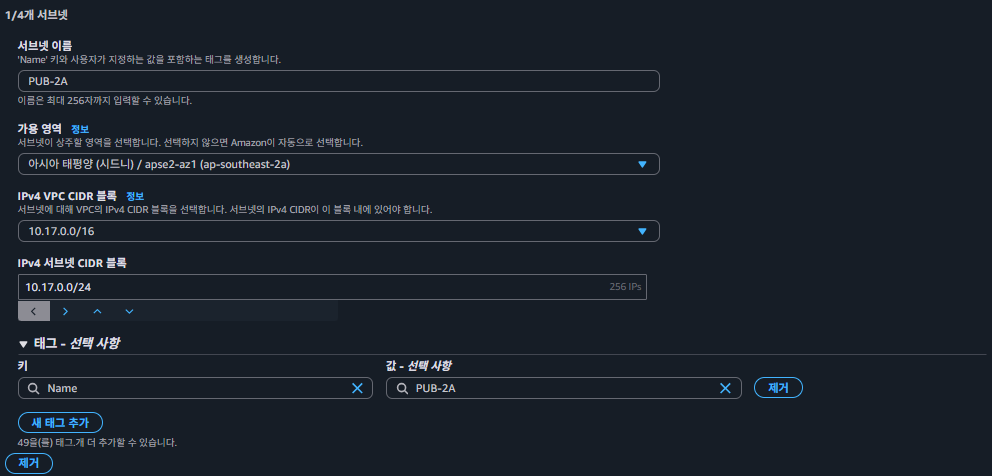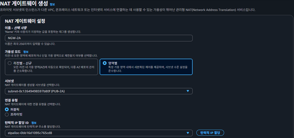 - 영역별 선택, 서브넷 PUB-2A를 선택, 탄력적 IP 적용