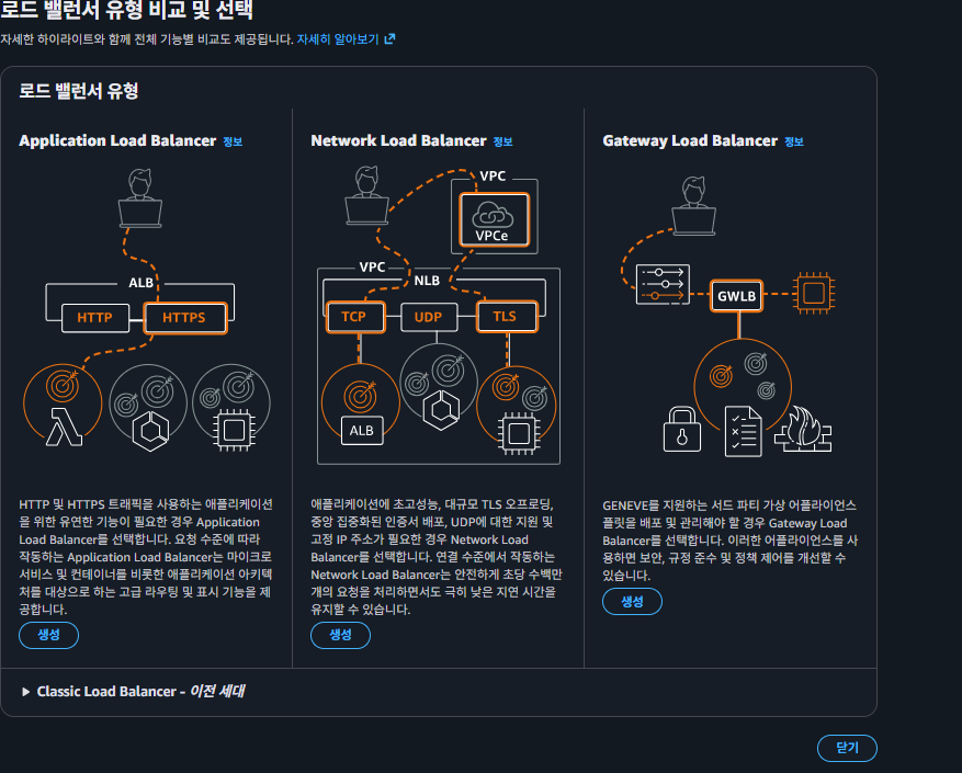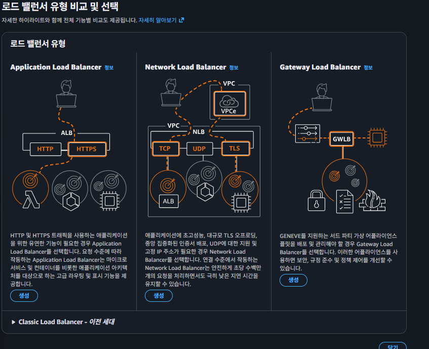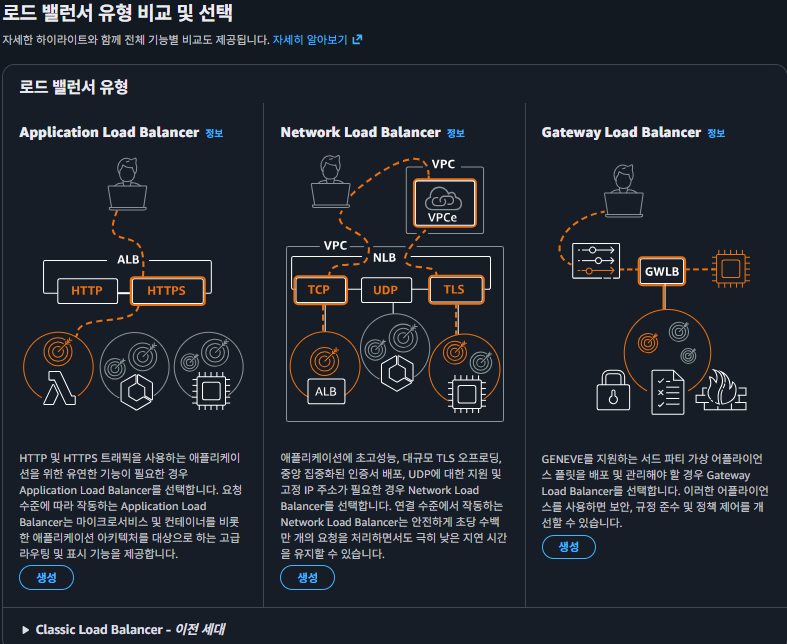 - CLB(Classic Load balancing) : 단순한 TCP/TLS(SSL) 및 HTTP/HTTPS 트래픽 분산에 사용