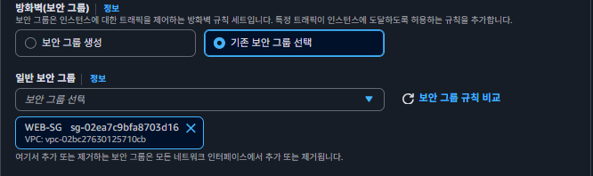 - 보안 그룹은 기존 보안 그룹 선택으로 하고, WEB-SG 만들어 놧던거 선택한다. 그리고 인스턴스를 시작한다.