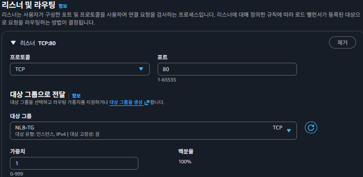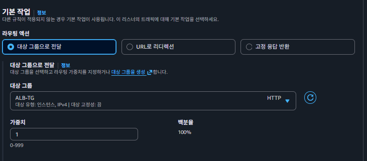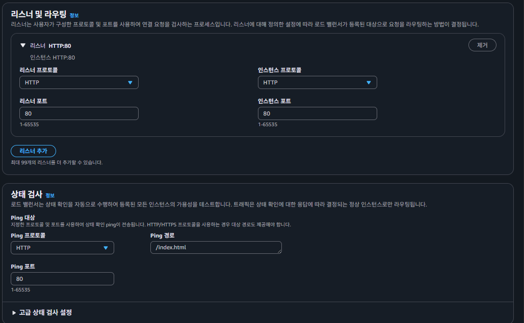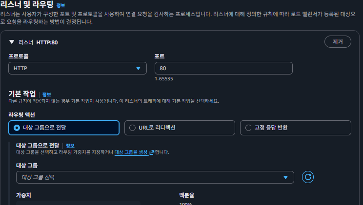 - 리스너 및 라우팅 부분 만들 때, 대상 그룹을 생성을 눌러서 만든다.