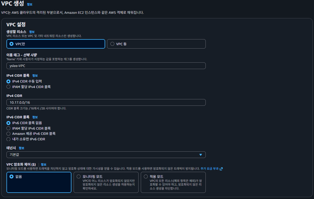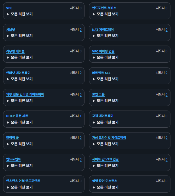 - 처음 시작할 때는 모두 꺼져 있다. VPC 설정 부터 한다.