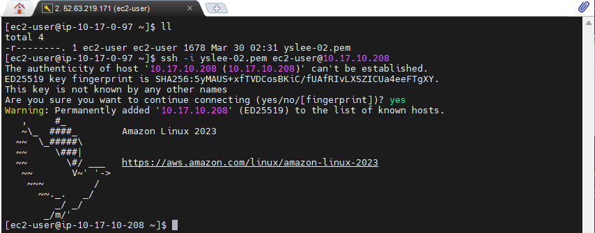 ssh -i yslee-02.pem yslee-02.pem ec2-user@10.17.10.208