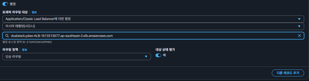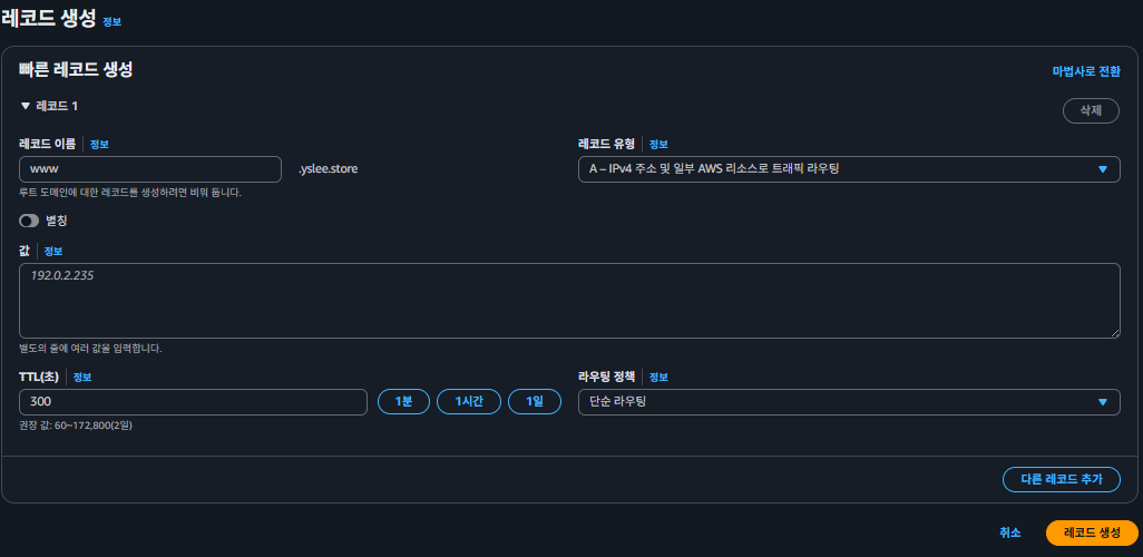 - 호스팅 영역 으로 들어간다. > 레코드를 생성한다.