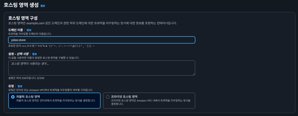 - 호스팅 영역을 생성하면, 네임서버에 넣을 값을 줄 것이다. 퍼블릭 호스팅 영역선택한다.