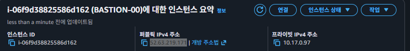 - BASTION 인스턴스 보면 Public IP 생성되어 있다.