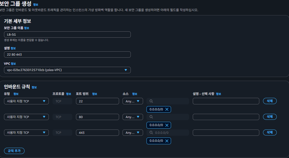 - LB-SG 인바운드 규칙에 22, 80, 443 을 선택한다. 0.0.0.0/0을 선택해서 생성한다.