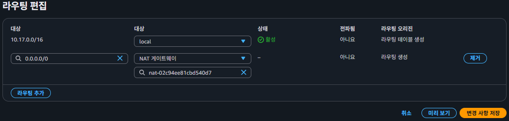 - PRI 부분에는 NAT 게이트웨이를 설정해준다. (Fail상태로 되버리면 그냥 하나 다시 생성하는 게 맘 편하다.)