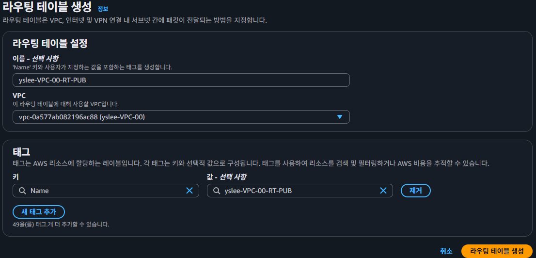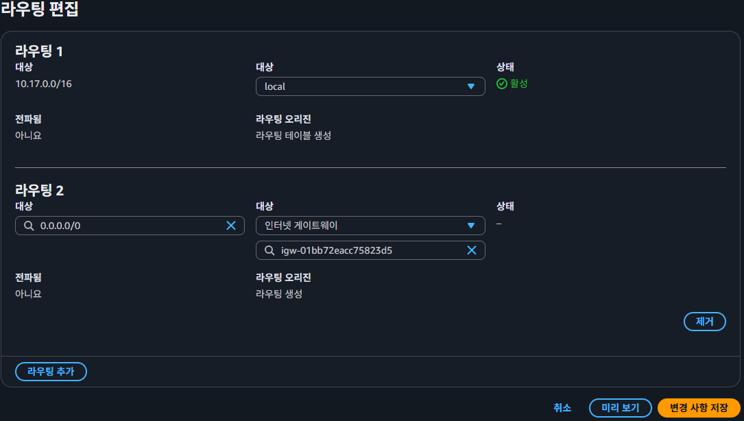 - Routing table : VPC 내부/외부 트래픽 흐름 제어