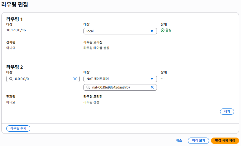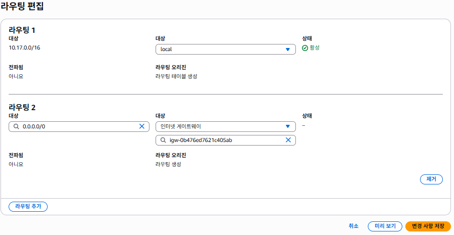 > 0.0.0.0/0 Routing 추가 (PUB)