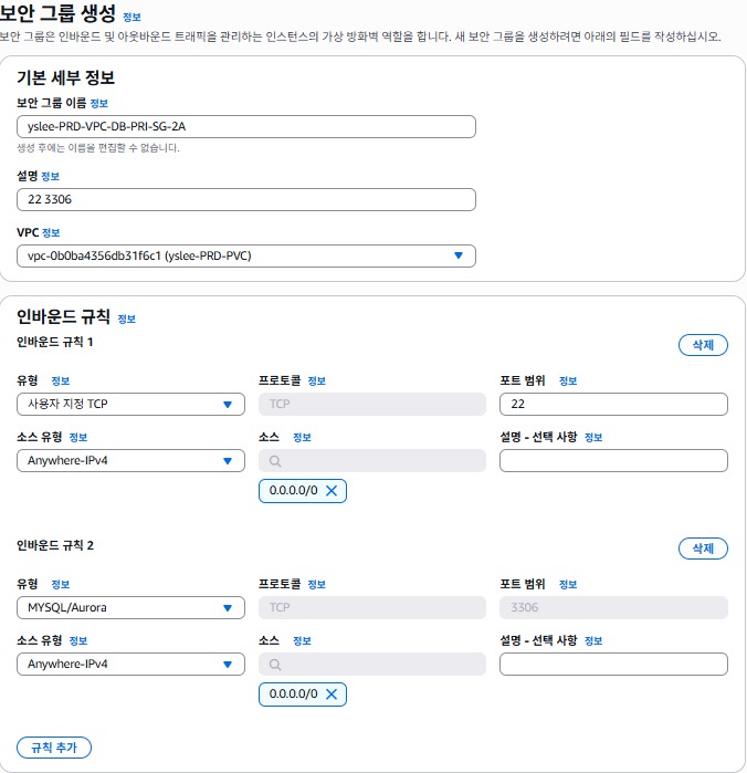 - xx-PRD-VPC-DB-PRI-2A = 22, 3306
