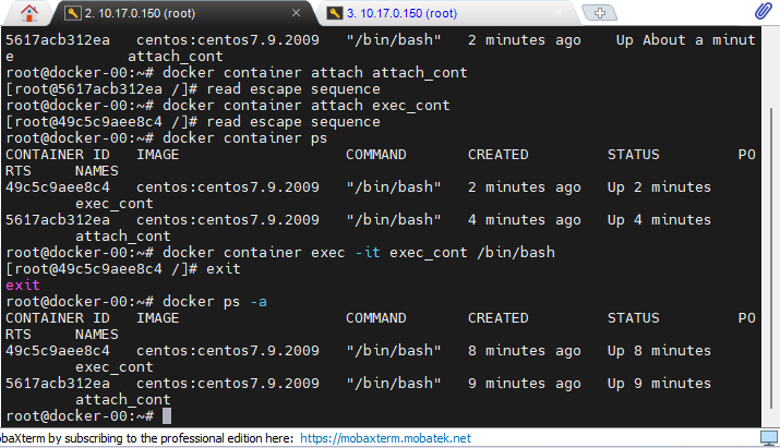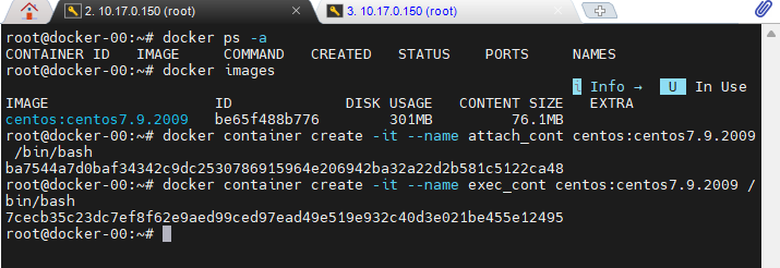 docker container run -it --name attach_cont centos:centos7.9.2009 /bin/bash