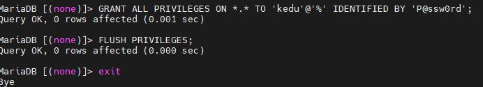 GRANT ALL PREVILEGES ON *.* TO 'kedu'@'%' IDENTIFIED BY 'P@ssw0rd';