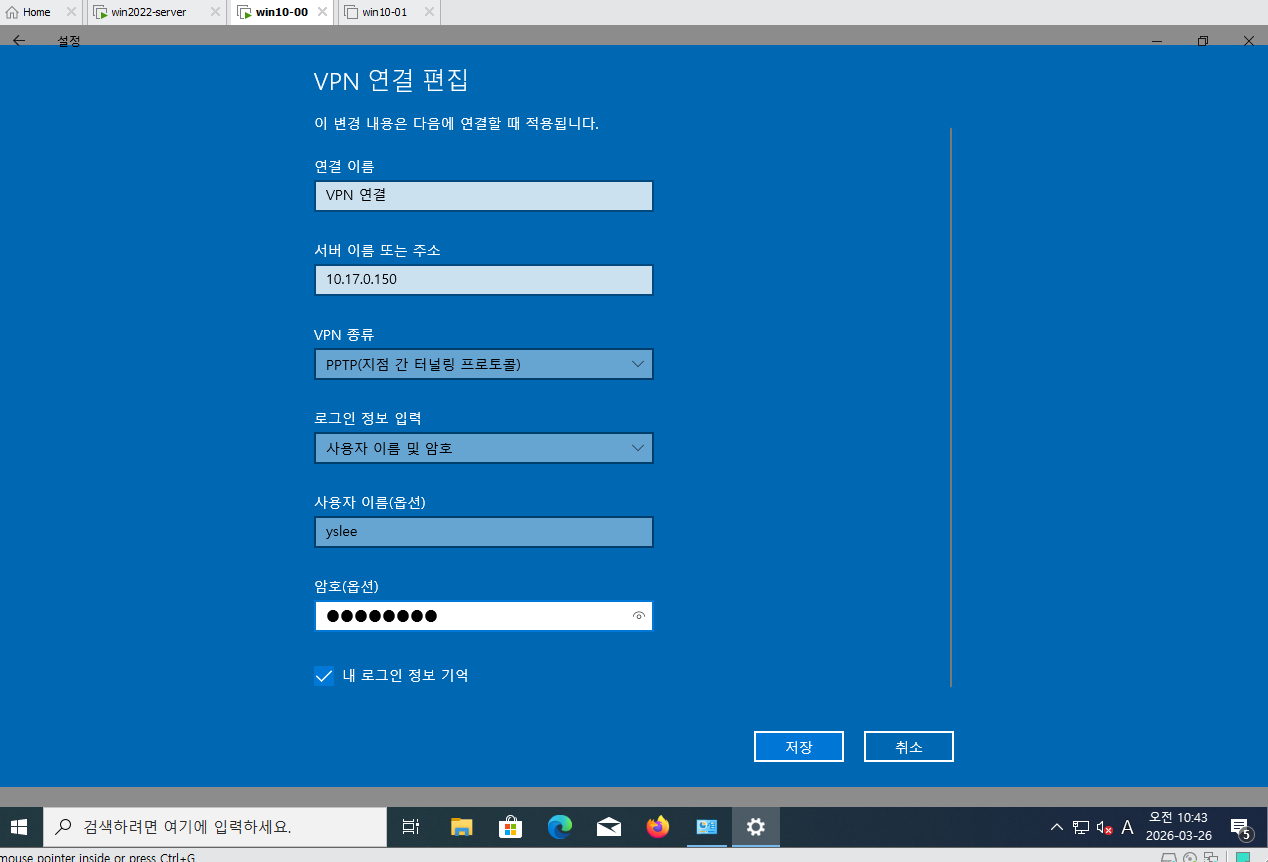 - VPN 고급으로 수정해야하는데, 사용자 이름, 암호를 입력하고 저장한다.