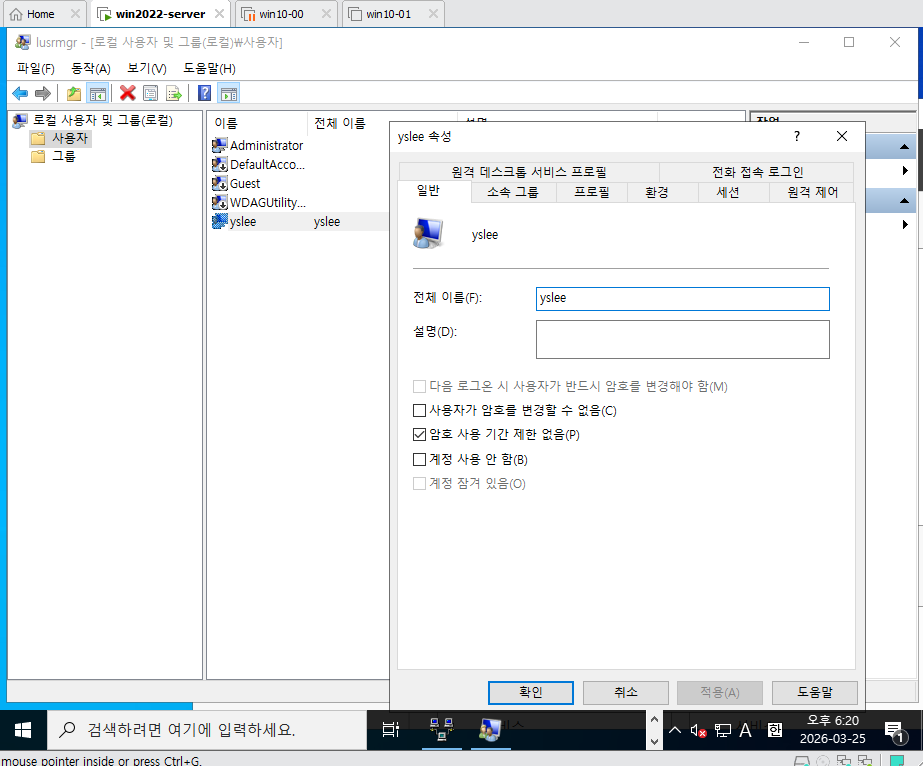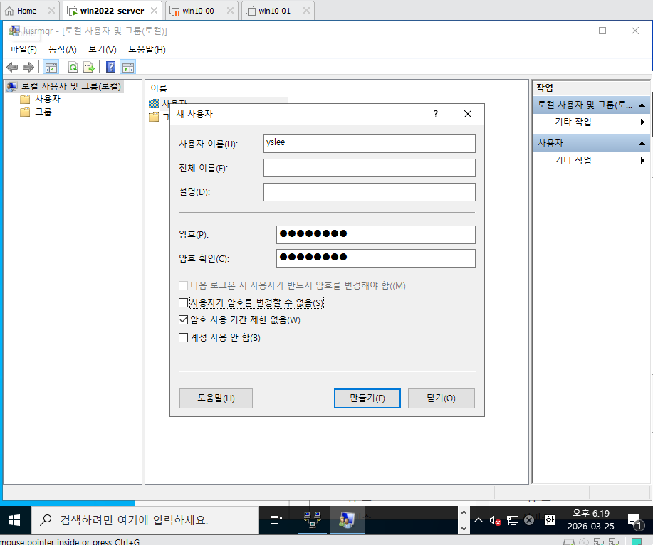 - 새 사용자 체크하고 암호기간 제한 없음으로 놓고 만든다.